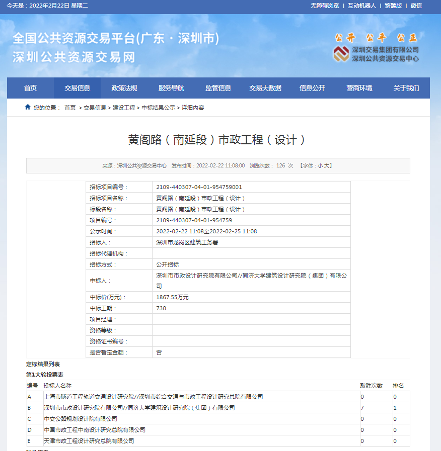 2022年2月22日,經深圳市公共資源交易中心中標公示通過,深圳市政院與同濟大學建筑設計研究院(集團)有限公司(聯合體)在深圳市龍崗區建筑工務署黃閣路(南延段)市政工程(設計)項目公開招標中成...