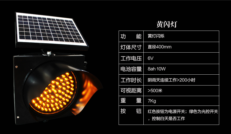 太陽能信號燈是由太陽能板,蓄電池,控制器,LED信號燈組成的發(fā)光警示標(biāo)志,產(chǎn)品常年不適用市電,有太陽能板發(fā)電,蓄電池儲存,陰雨天可連續(xù)適用7天左右。
